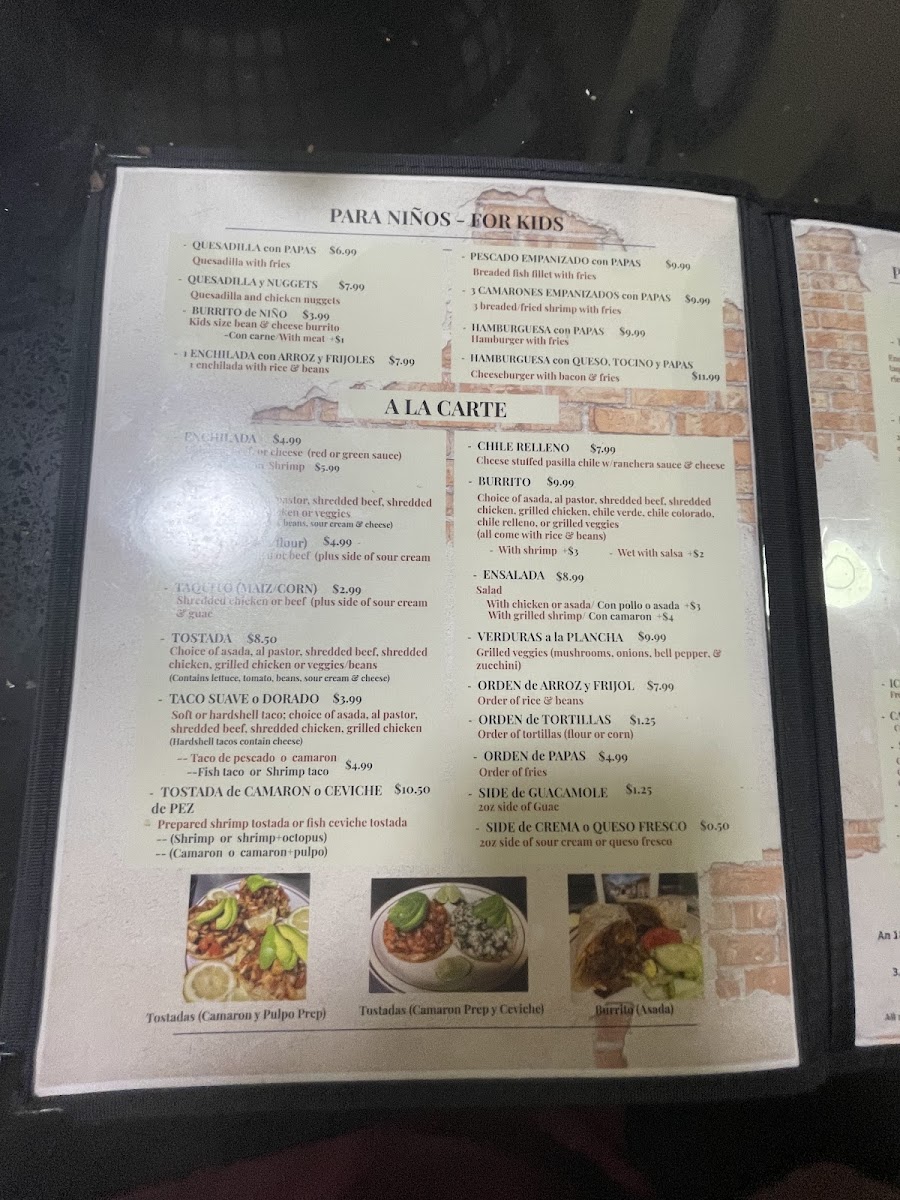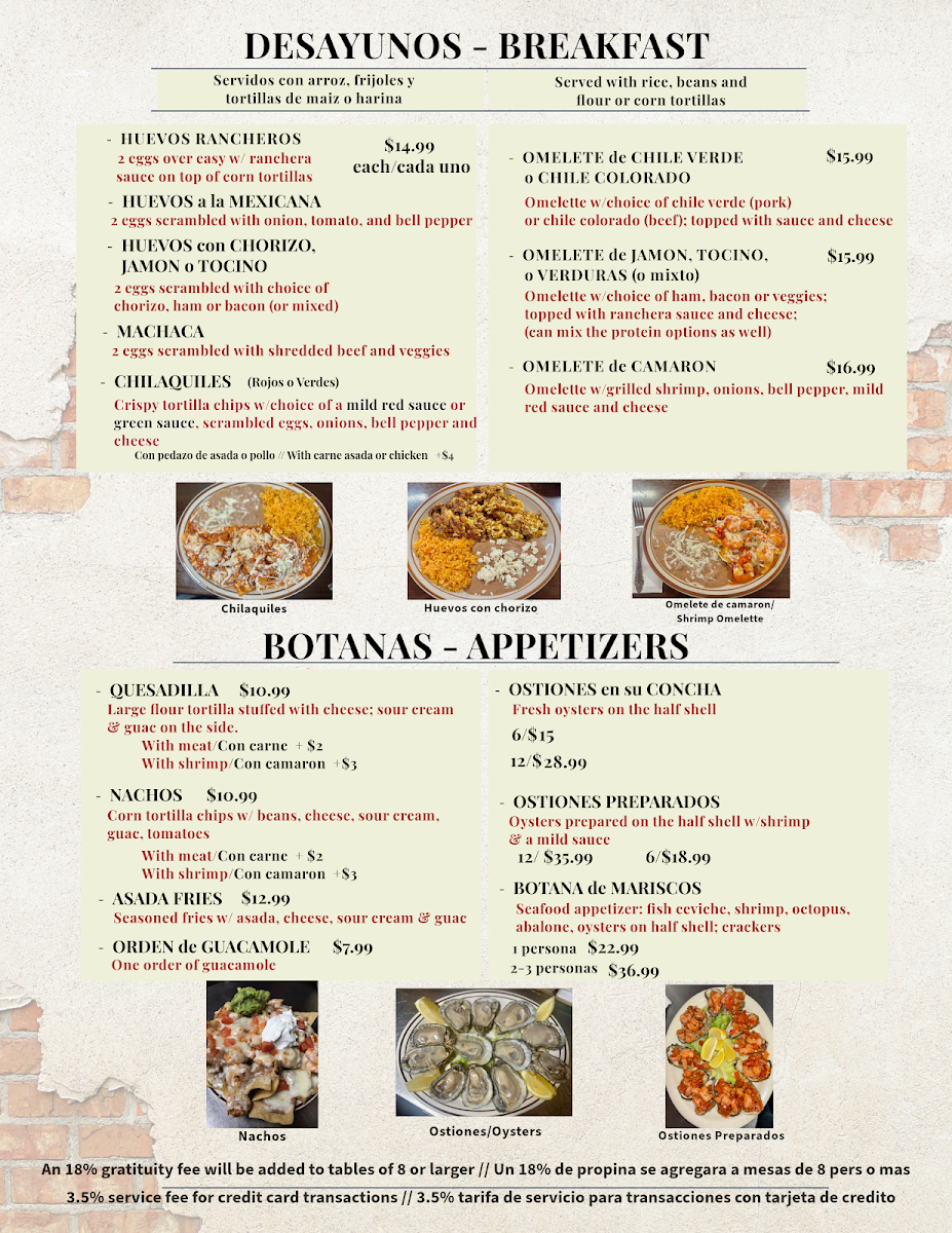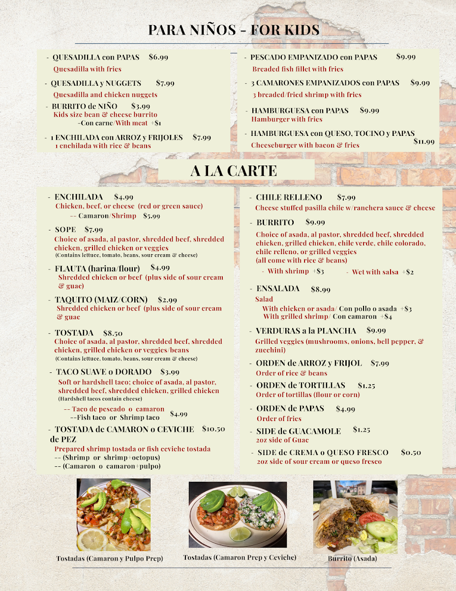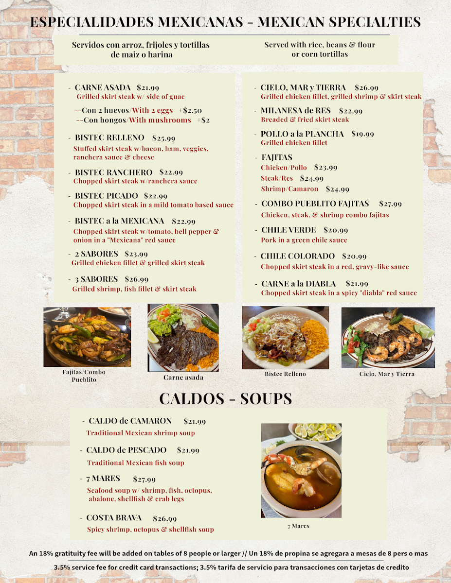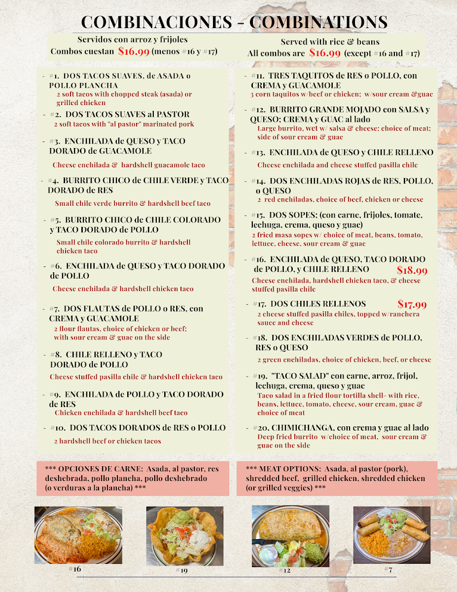 Served with rice beans and choice of flour or corn tortillas (servidos con arroz frijoles y tortillas de maiz o harina ).