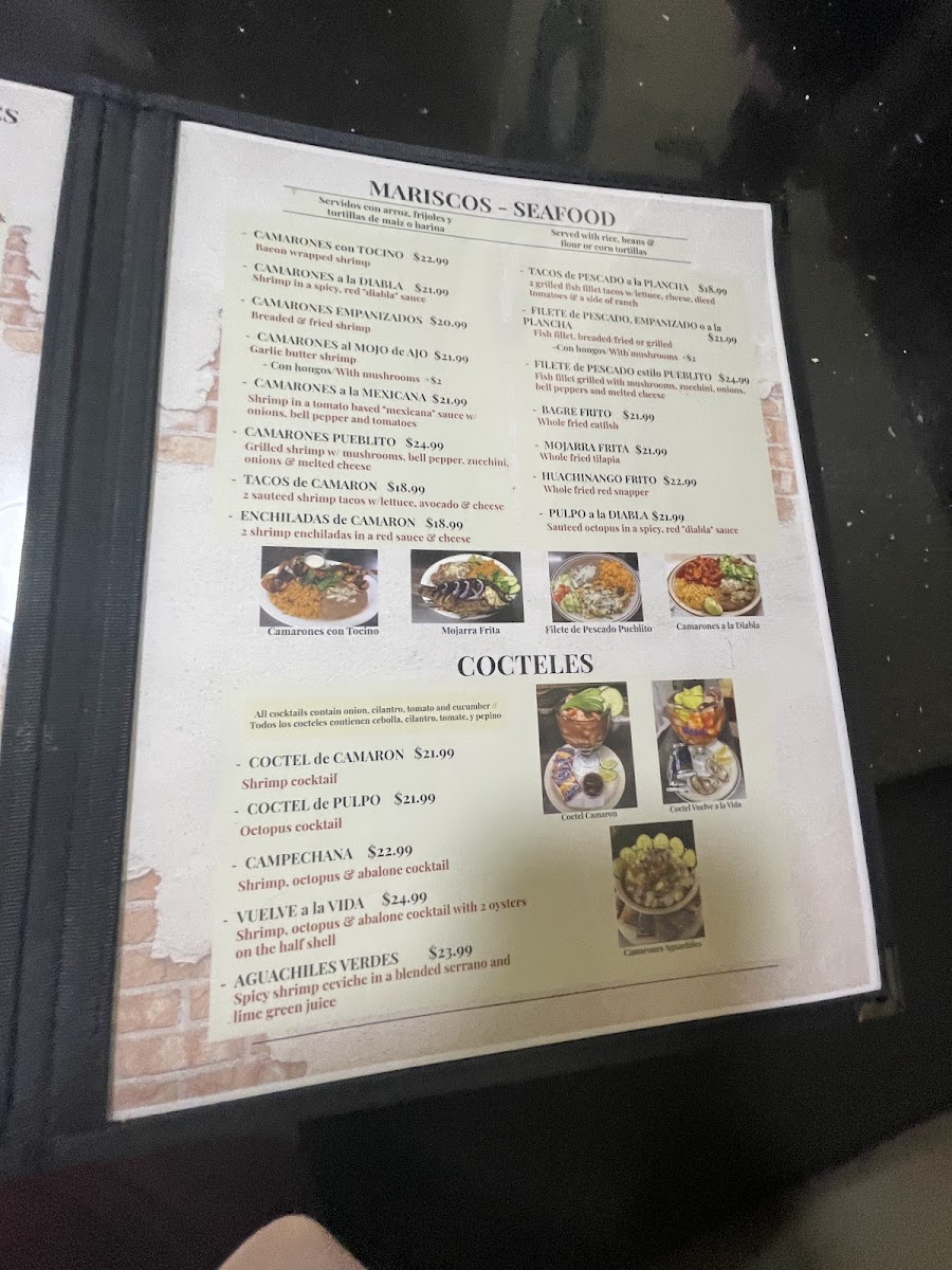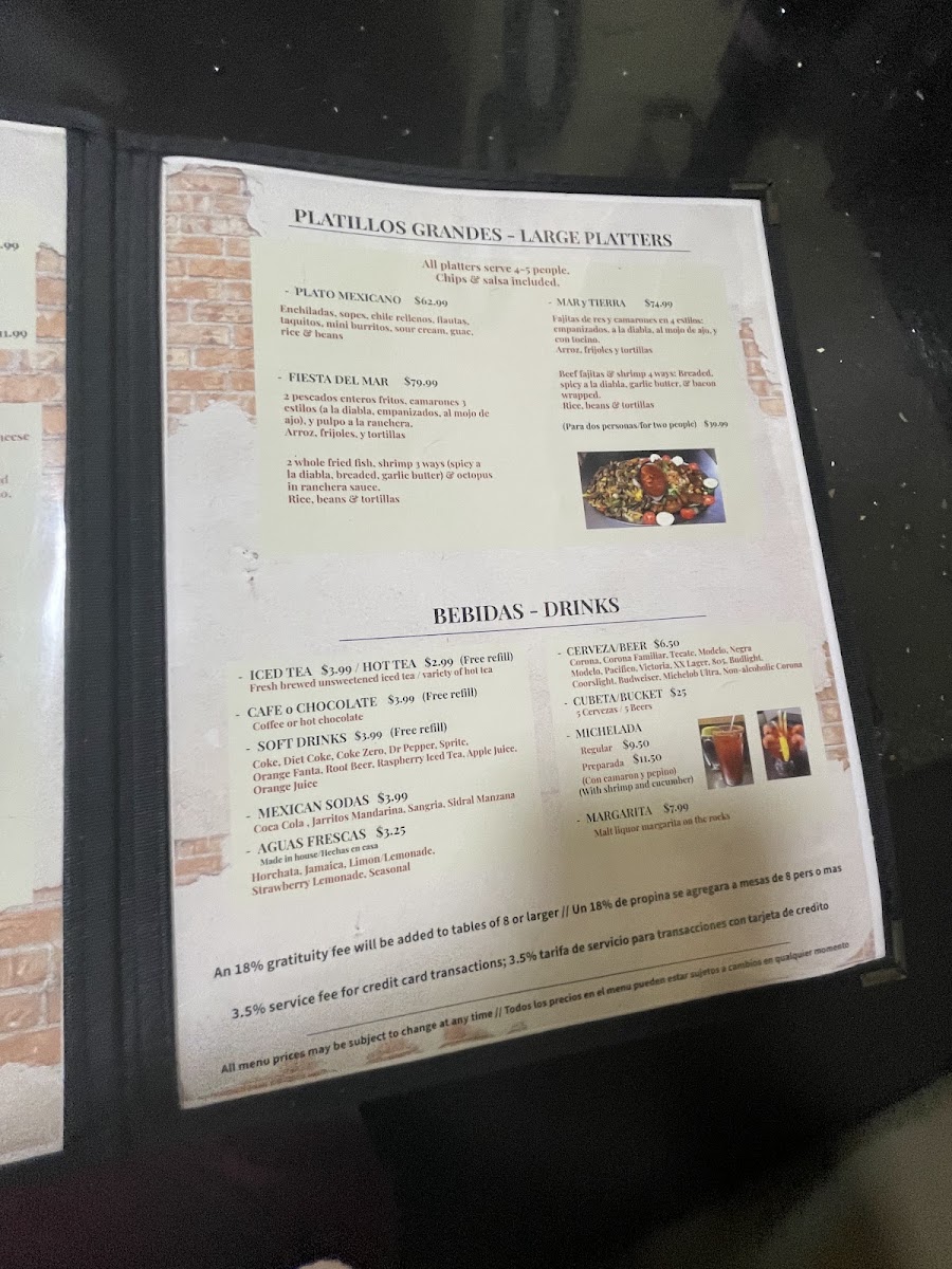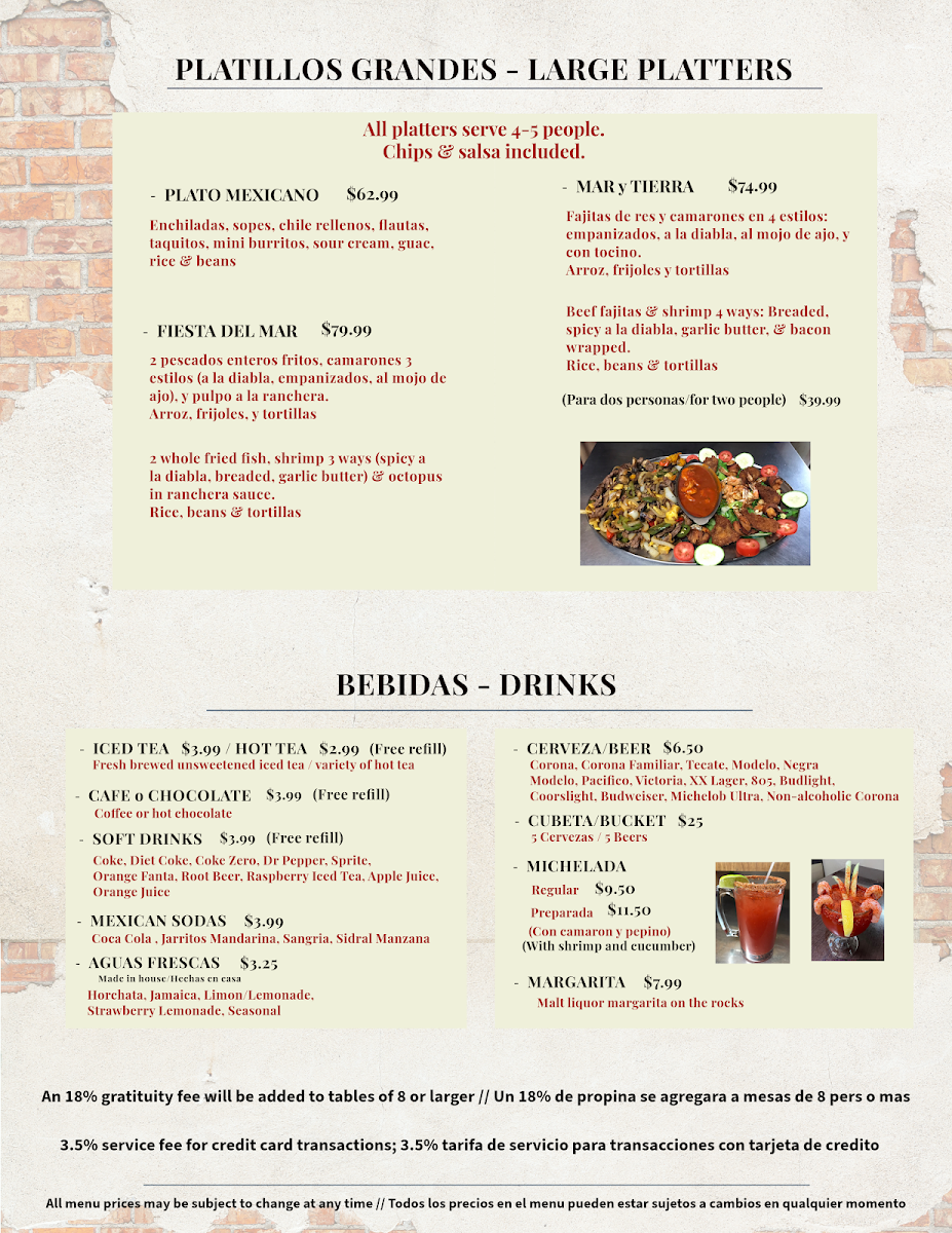 2 Whole fried fish, shrimp 3 ways (a la diabla, breaded and fried, and garlic butter), sauteed octopus in ranchera sauce, rice, beans, tortillas. Chips and salsa (4-5 people).